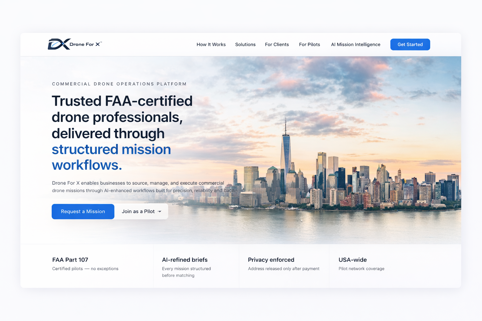 Designed for both clients and FAA Part 107-certified pilots, DFX introduces a more structured and trustworthy way to execute commercial drone work through a platform-centered workflow focused on clarity, privacy, and operational control.